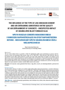 The test results indicate that it is possible to obtain the appropriate quality of air entrainment in concrete with low-emission cement with granulated blast furnace slag, such as CEM II/B-S, CEM III/A and CEM III/A-NA. However, the literature on the subject reports that this is not the rule, and a slag content that is too high is not conducive to the effectiveness of the air-entraining admixture and the stability of the air entrainment. The possible reason for the beneficial effect of slag on the stability of air entrainment was the influence of surfactants used for its grinding. The research also proved that the effectiveness of the air-entraining impact and the stability of air entrainment in concrete with slag cement depend on its type (natural or synthetic) and the alkali content in the cement. (Rezultaty badań wskazują, iż możliwe jest uzyskanie odpowiedniej jakości napowietrzenia betonu z cementem niskoemisyjnym z żużlem granulowanym wielkopiecowym S, jak CEM II/B-S, CEM III/A i CEM III/A-NA. Jednak literatura przedmiotu donosi, iż to nie jest regułą, a zbyt duża zawartość żużla nie sprzyja efektywności działania domieszki napowietrzającej i stabilności napowietrzenia. Zatem granulowany żużel wielkopiecowy może pozytywnie bądź negatywnie wpływać na efektywność działania domieszki napowietrzającej oraz stabilność napowietrzenia. Za możliwą przyczynę korzystnego wpływu żużla na stabilność napowietrzenia wskazano wpływ środków powierzchniowo czynnych zastosowanych do jego przemiału. Na podstawie badań dowiedziono także, że efektywność działania domieszki napowietrzającej i stabilność napowietrzenia betonu z cementem żużlowym zależy od jej rodzaju (naturalna bądź syntetyczna) oraz od zawartości alkaliów w cemencie.)